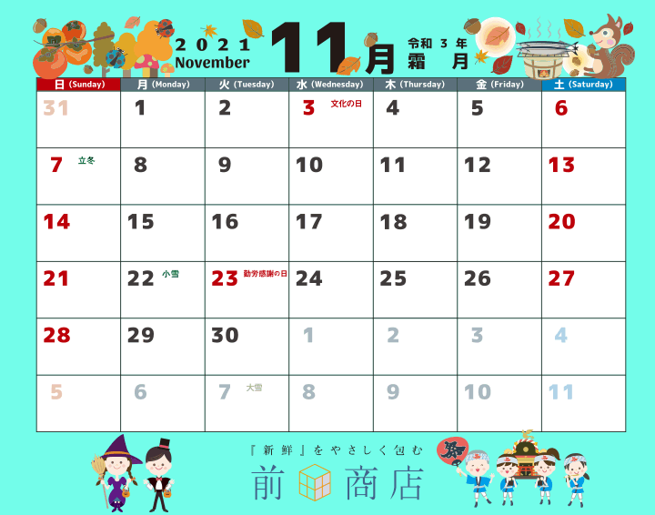 3日・23日は祝日の為、お休みです