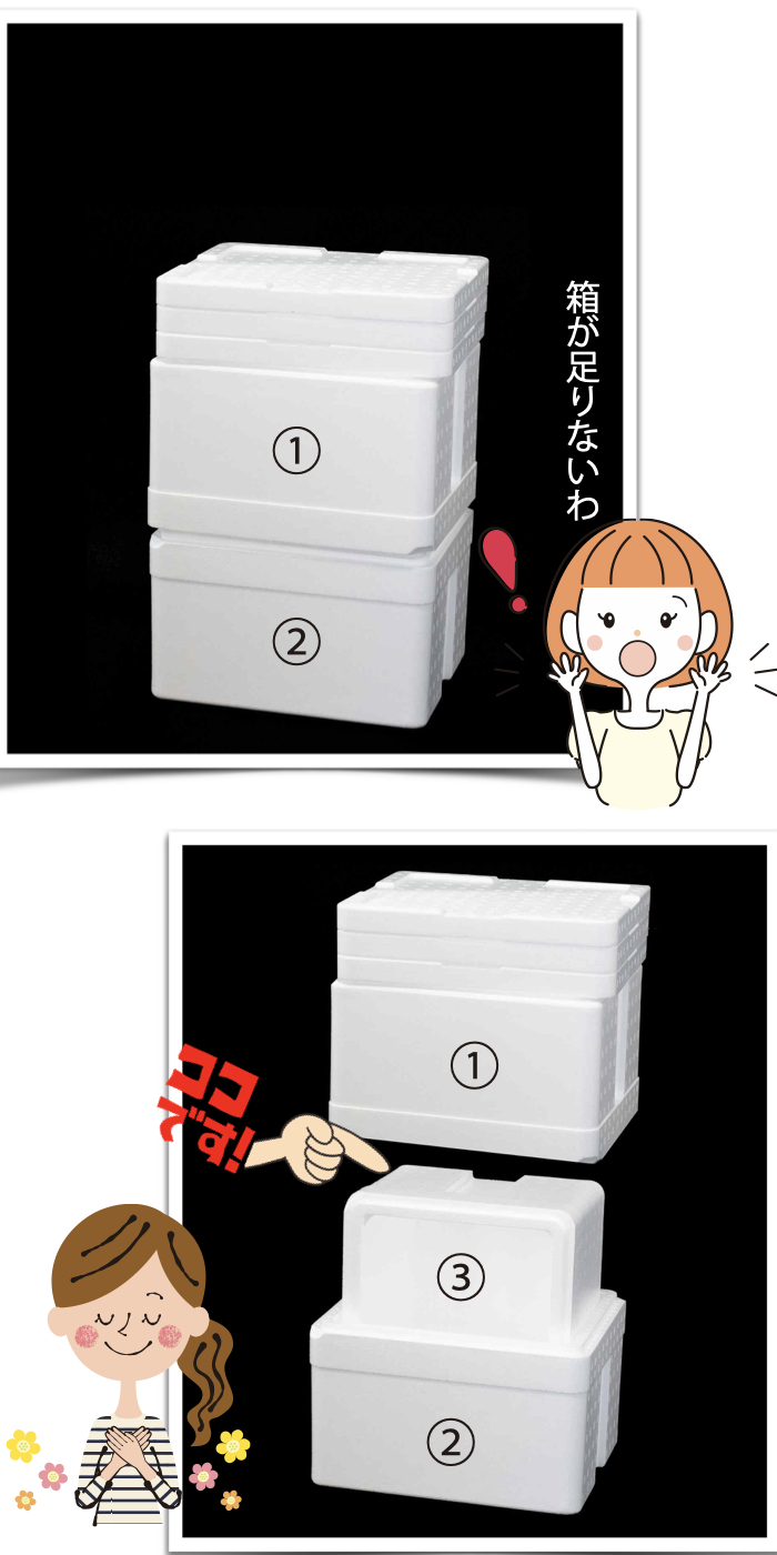 投稿日: 2023年11月7日2023年11月22日 『発泡スチロール(BOX3個+フタ3枚)注文したけど足らないわ!』 大丈夫です! 前田商店では、一定の送料で沢山発送できるよう 写真のように組み込んで発送しています。 『あれ!』と思った時にはご面倒ですがご確認をお願いします。